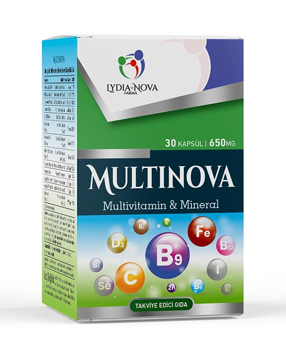 Multinova, vitamin ve mineral içeriğiyle formüle edilmiş bir multivitamin & mineral takviye edici gıdadır. Demir ve çinko başta olmak üzere; vitamin C, D3, E, B grubu vitaminleri, folat, iyot ve selenyum içeren dengeli formülü ile günlük beslenme rutinini desteklemek amacıyla geliştirilmiştir.